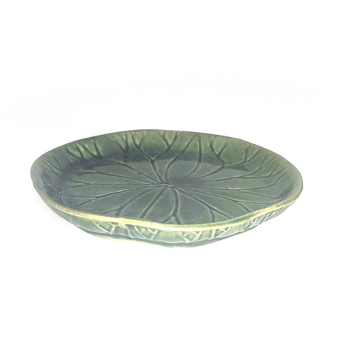 Een klein, asymmetrisch lotusschaaltje van geglazuurde keramiek. Diameter 10 cm. Het schaaltje is afgewerkt met reactief glazuur wat een bijzonder kleurpatroon creëert. Dit geeft elk item een uniek uiterlijk.