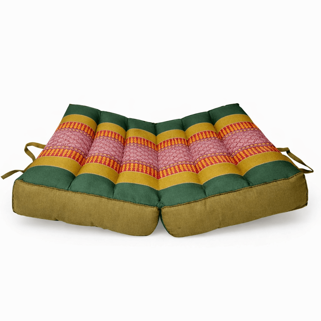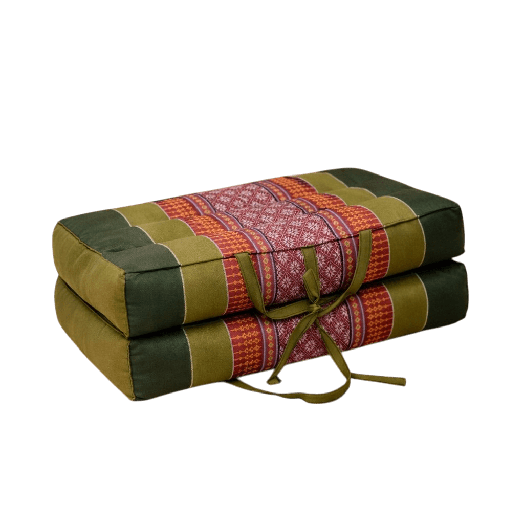 Draagbaar meditatiekussen olijfgroen rood – opvouwbaar zitkussen met kapok