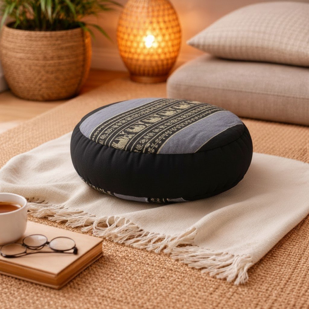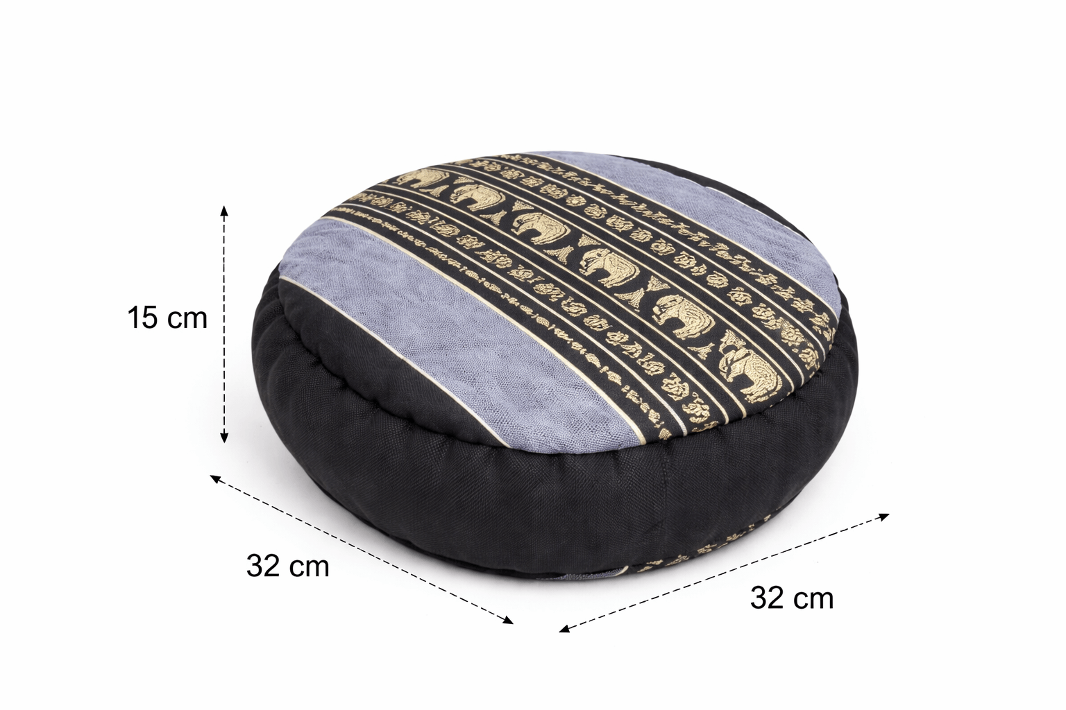 Dit zafu meditatiekussen in grijs zwart is een handgemaakt rond kussen in traditionele Thaise stijl, ideaal voor meditatie, yoga en ontspanning. Het kussen ondersteunt een stabiele en comfortabele zithouding, waardoor je langer ontspannen kunt zitten zonder spanning in je lichaam.