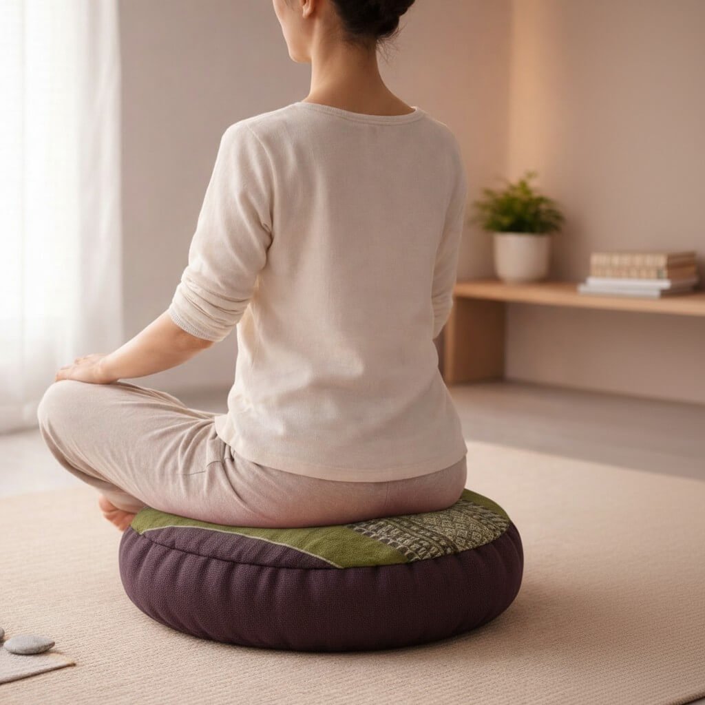 Een zafu kussen ondersteunt je bekken en helpt je rug recht te houden tijdens het zitten. Hierdoor kun je langer comfortabel blijven zitten zonder spanning in je onderrug of benen.