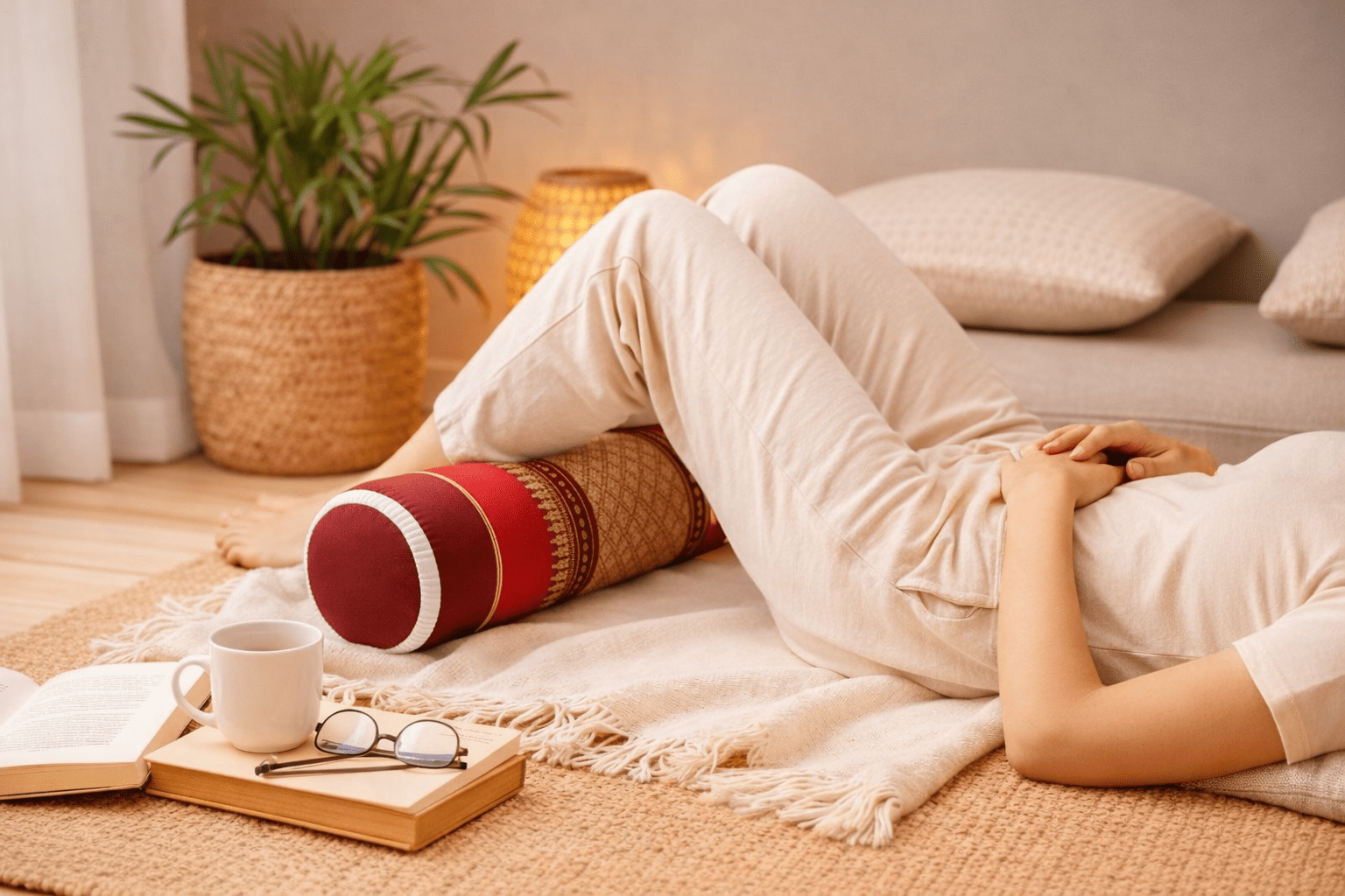 Dit knierolkussen is op verschillende manieren te gebruiken. Het biedt ondersteuning onder de knieën of benen tijdens yoga en meditatie, zorgt voor extra comfort tijdens massages en is ook geschikt als relaxkussen op de bank. Daarnaast kan het dienen als decoratief element met een warme, Aziatische uitstraling.