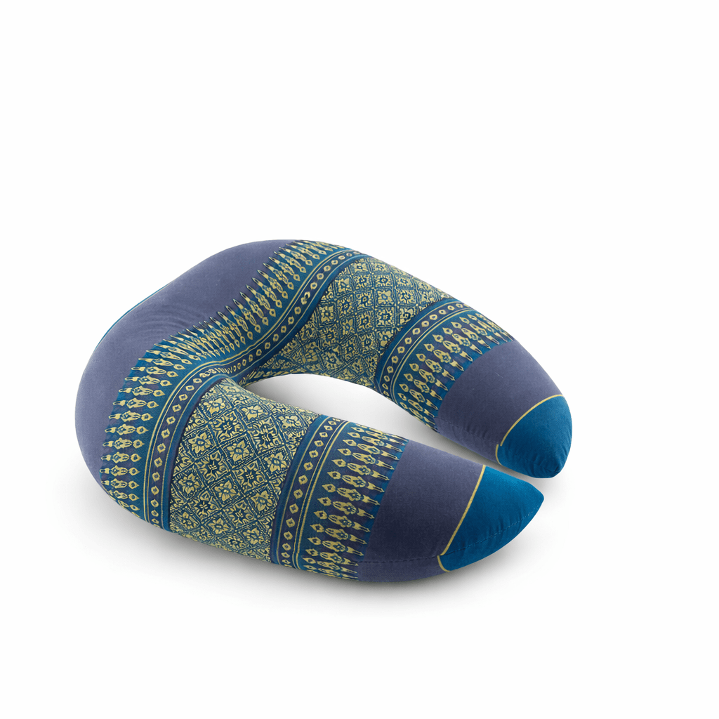 Nekkussen in blauw grijs met kapokvulling. Stevig kussen dat zich vormt naar je lichaam en zorgt voor comfortabele ondersteuning tijdens reizen en ontspanning.