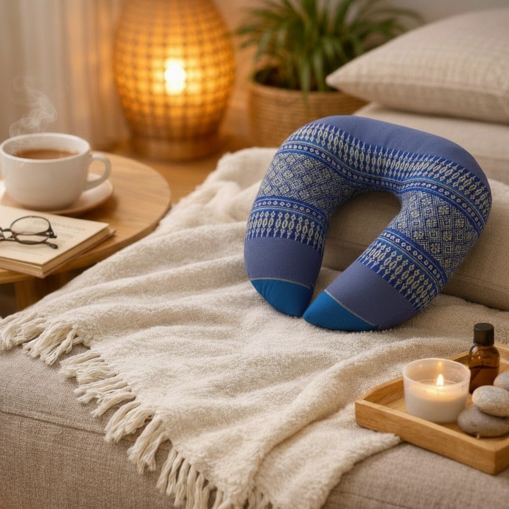 Dit nekkussen in blauw grijs heeft een moderne en rustige uitstraling en biedt fijne ondersteuning tijdens reizen, rusten en ontspannen. De combinatie van kleuren zorgt voor een kalme sfeer, terwijl de vorm helpt om je nek en schouders te ontlasten.