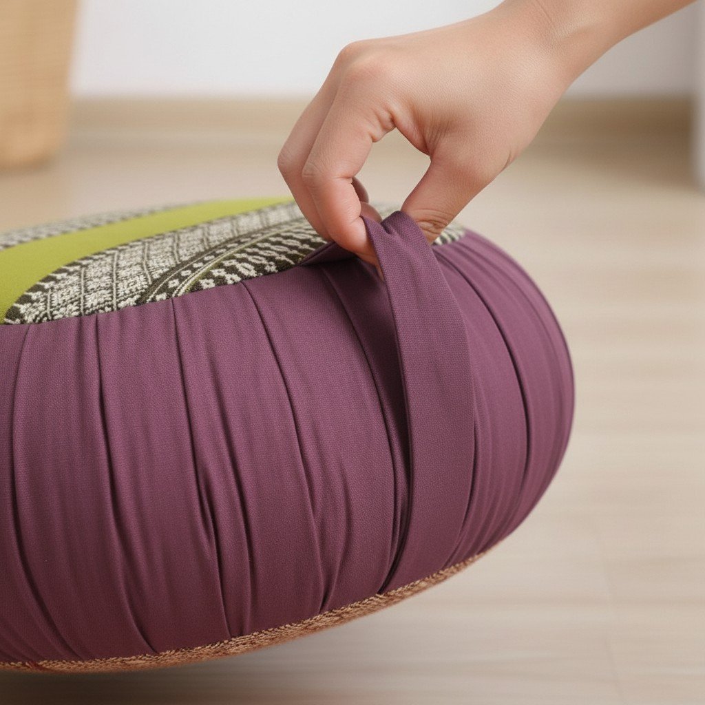 Zafu meditatiekussen groen bruin – rond yoga kussen met kapok en draaglus