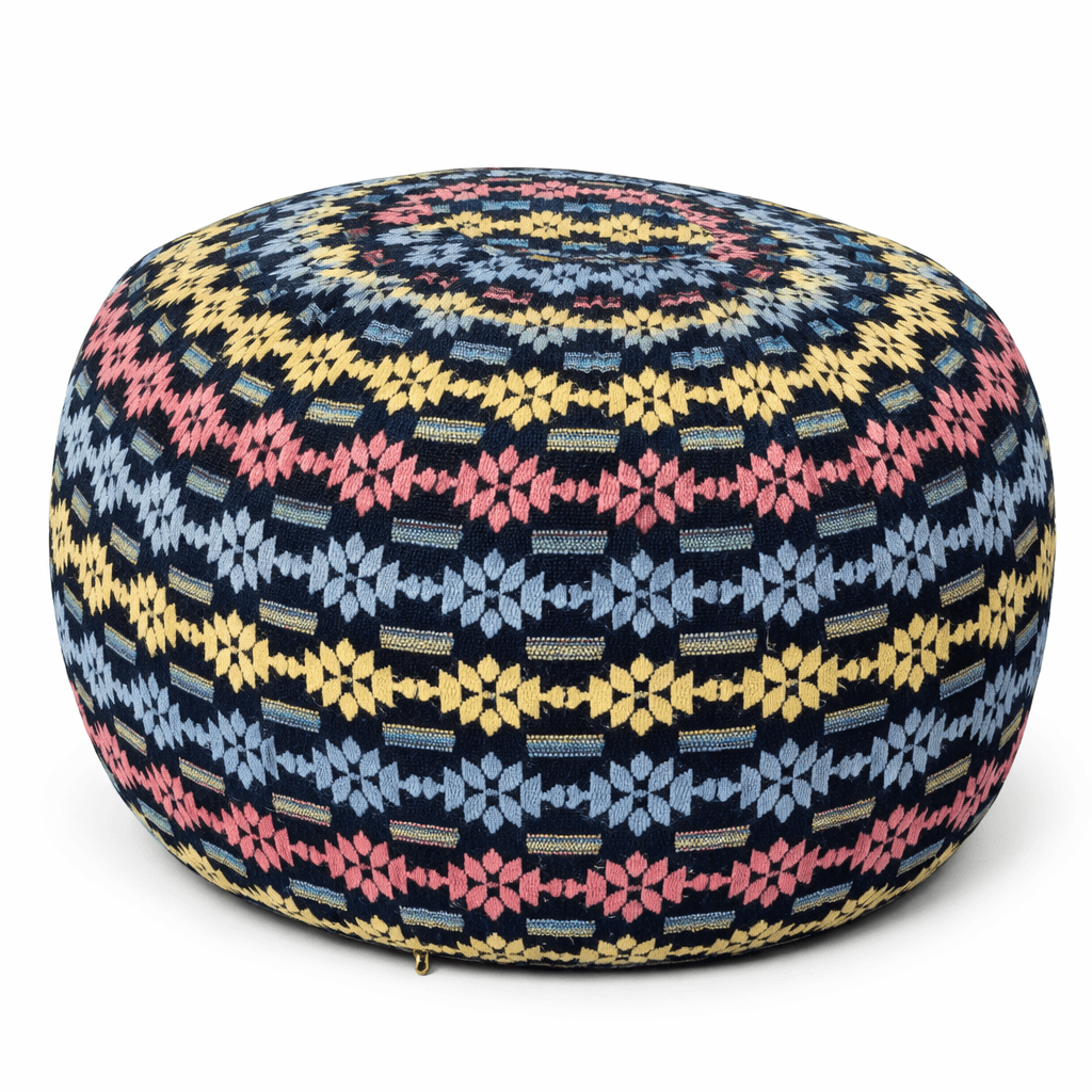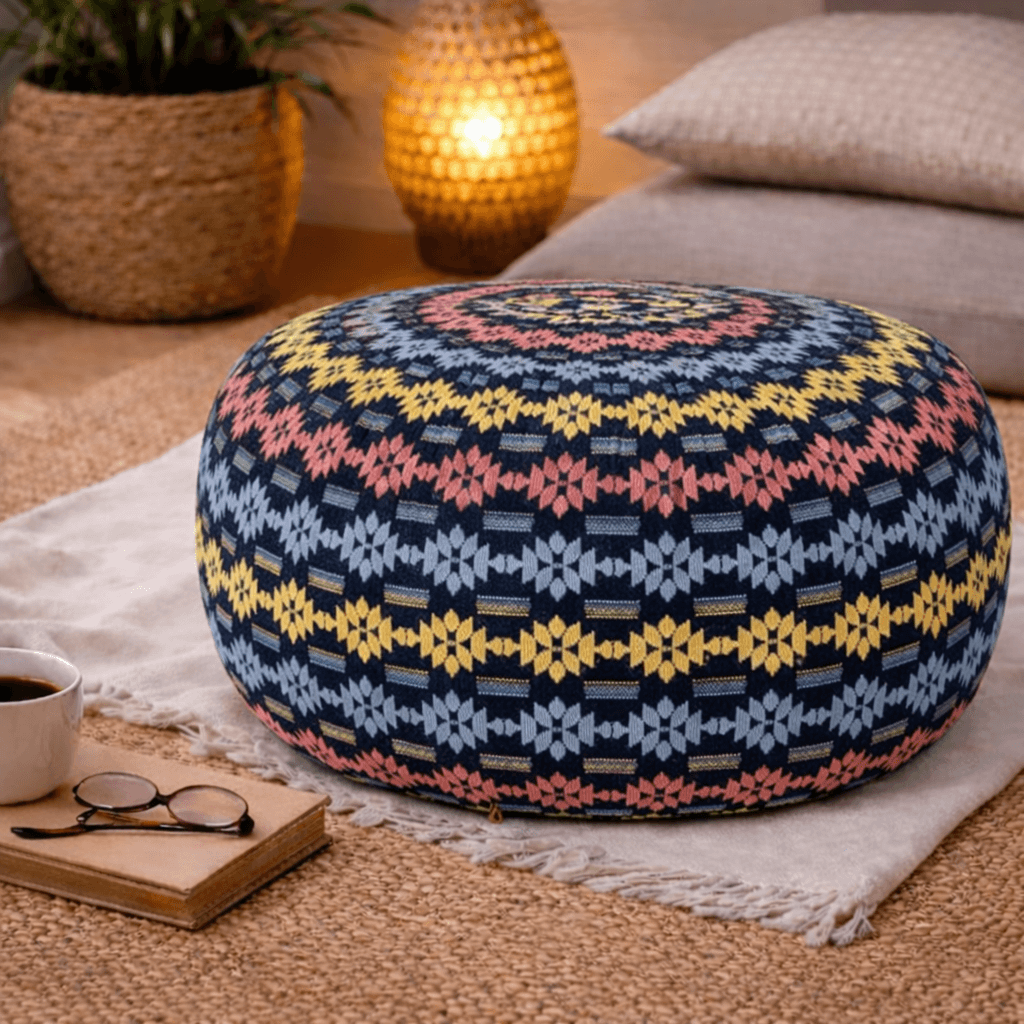 De poef is met de hand gemaakt van katoen en gevuld met kapok. Dit zorgt voor een stevig, natuurlijk en duurzaam product dat lang meegaat.