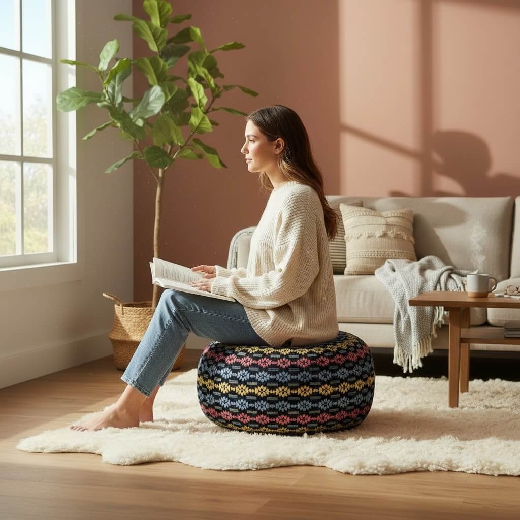 Bij eerste gebruik voelt hij stevig aan, wat zorgt voor goede ondersteuning. Na verloop van tijd wordt de vulling iets soepeler, terwijl de poef zijn vorm en stabiliteit behoudt.