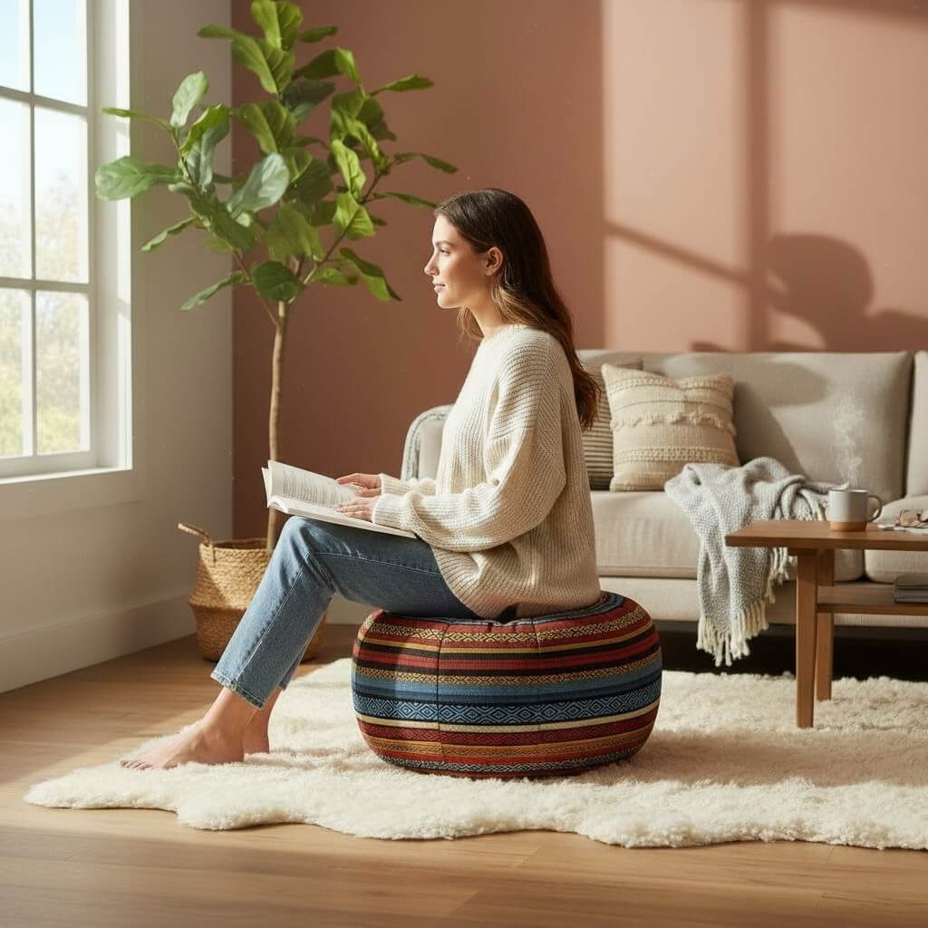 Gebruik de poef in een leeshoek, meditatieplek of gewoon in de woonkamer. Hij is compact genoeg om makkelijk te verplaatsen en groot genoeg om comfortabel op te zitten.