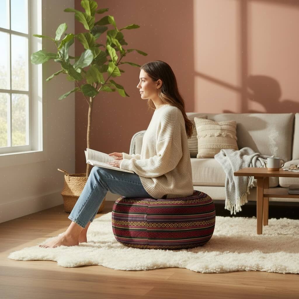 De kapokvulling zorgt voor een compacte en stabiele zit. Hierdoor behoudt de poef zijn vorm, zelfs bij regelmatig gebruik.