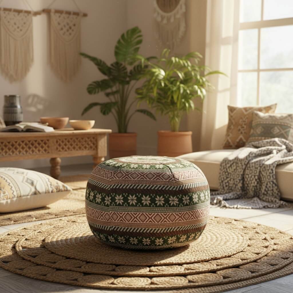 Het veelzijdige ontwerp van deze poef maakt het ideaal voor verschillende toepassingen in huis. Gebruik het als extra zitplaats, een comfortabele voetenbank of als een decoratief accentstuk in je woonkamer, slaapkamer of meditatieruimte. Het lichte gewicht en de praktische afmetingen maken het gemakkelijk om de poef te verplaatsen naar waar je hem nodig hebt.
