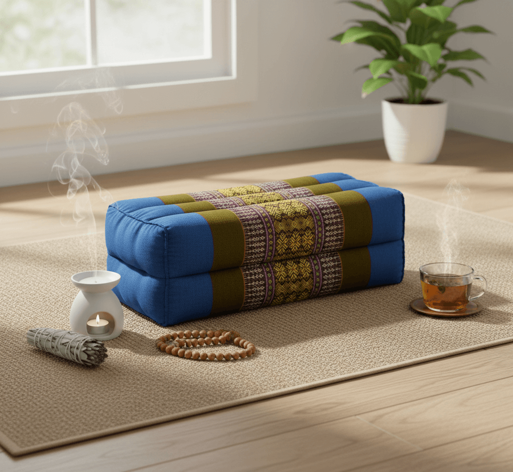 Breng kleur, comfort en authenticiteit samen in jouw meditatie- of yogaruimte met dit handgemaakte Thaise meditatiekussen in turquoise en olijfgroen.