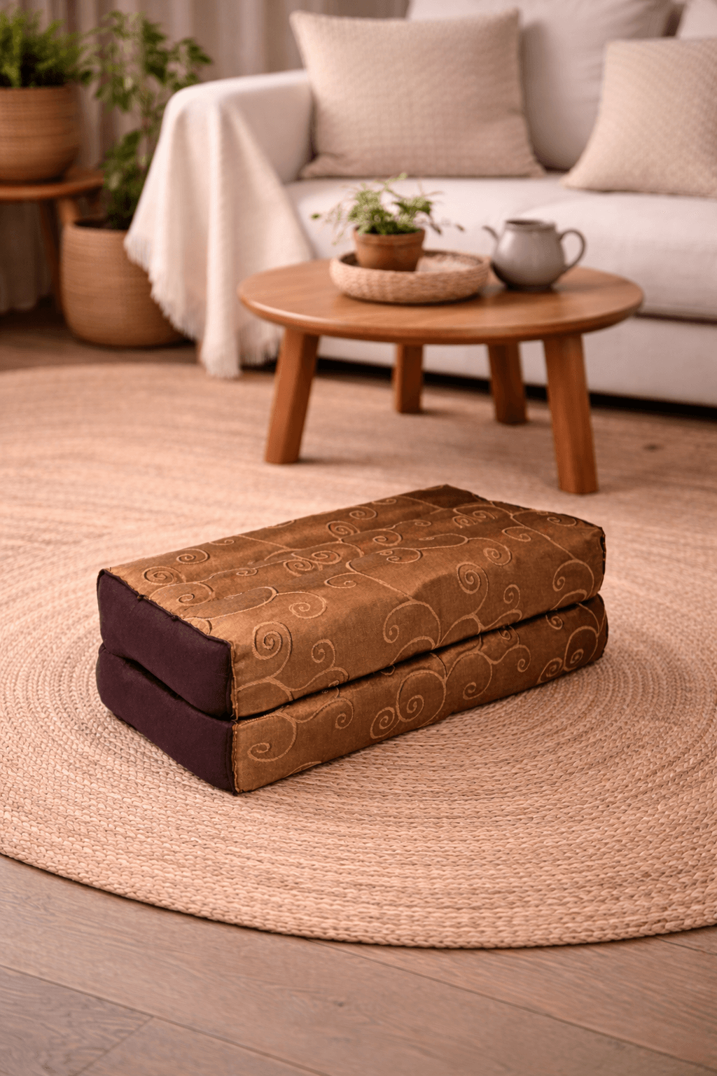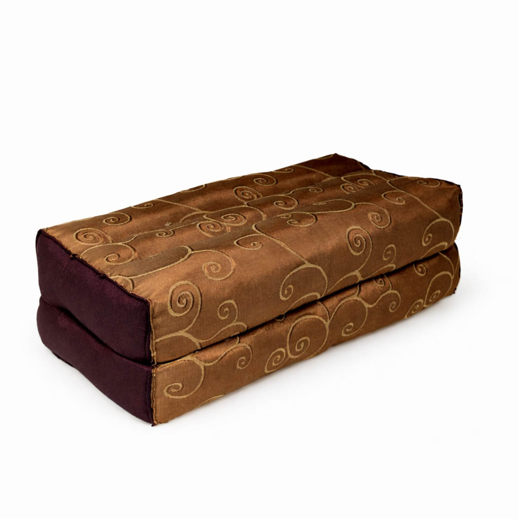 Rechthoekig Thais hoofdkussen met elegante bruine zijden look en goudkleurige krulprint – handgemaakt en gevuld met natuurlijke kapok. Ideaal voor ontspanning, massage of yoga. De luxe glansstof en het stevige design bieden zowel comfort als stijl in elke wellnessruimte.