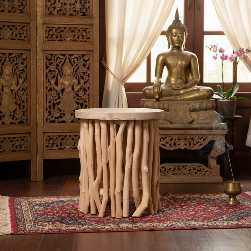 Dit krukje is gemaakt van rubberwood en volledig handgemaakt. Rubberwood staat bekend om zijn stevigheid en duurzaamheid. Het hout heeft een warme uitstraling en past goed binnen een natuurlijke woonstijl.