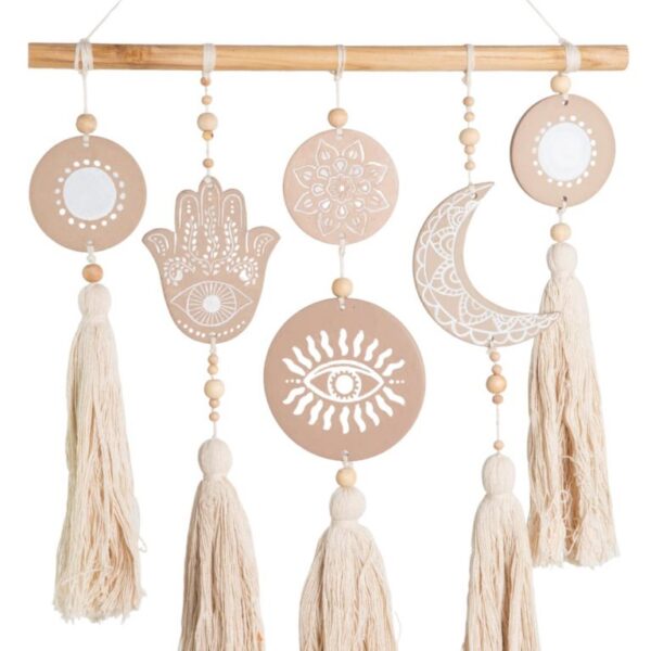 De hanger bevat verschillende symbolen die wereldwijd bekend staan om hun betekenis en beschermende energie. Samen vormen zij een harmonieuze en decoratieve muurversiering.
