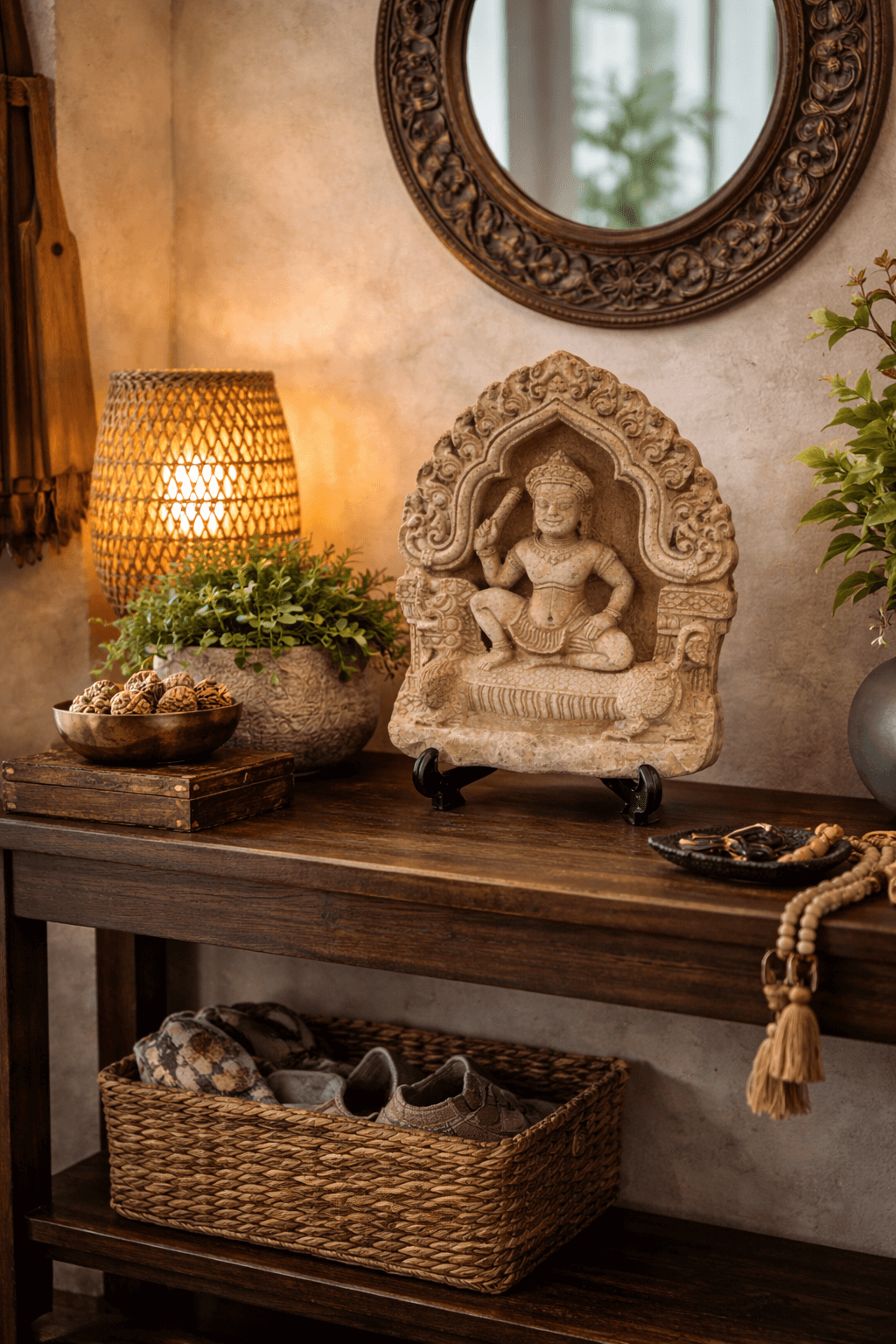 Deze decoratie past perfect in een ruimte waar sfeer, balans en een warme uitstraling centraal staan. Denk aan een woonkamer, meditatiehoek of een oosters geïnspireerde inrichting.