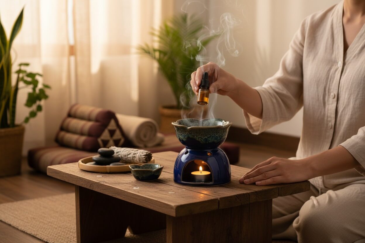 Vul het schaaltje met water en voeg enkele druppels etherische olie toe. Plaats een brandend theelichtje onderin de verdamper zodat de geur zich langzaam verspreidt.