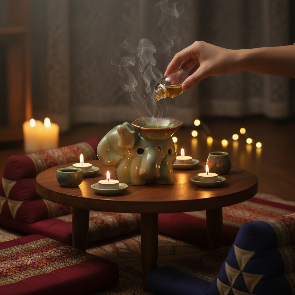 Vul het schaaltje met water en voeg enkele druppels etherische olie toe. Plaats een brandend theelichtje onderin de verdamper zodat de geur zich rustig verspreidt en een ontspannen ambiance creëert.